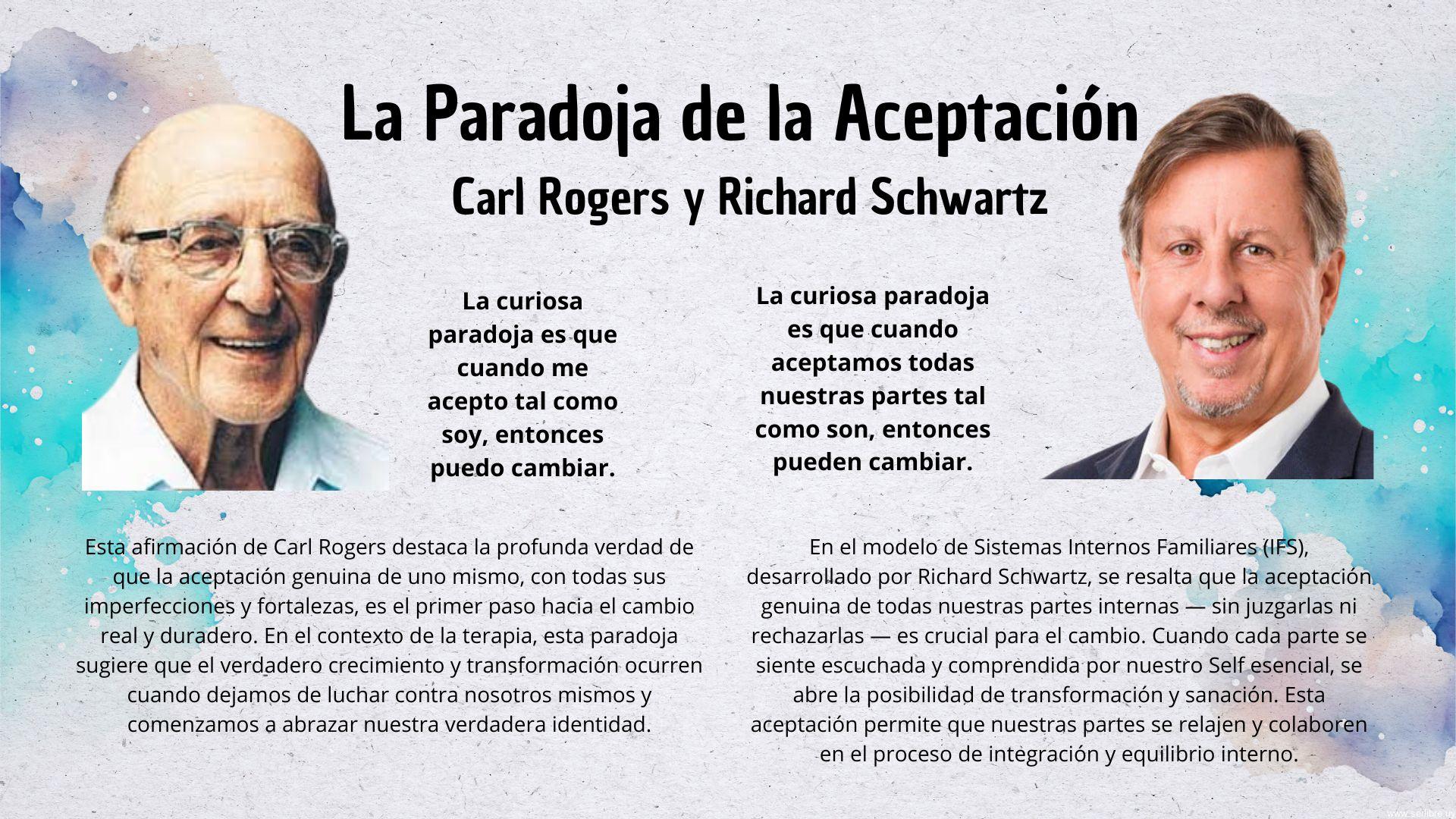 En el mundo de la psicoterapia, una de las paradojas más poderosas y profundas es la formulada por Carl Rogers: “La curiosa paradoja es que cuando me acepto tal como soy, entonces puedo cambiar”. Esta afirmación resuena fuertemente no solo en el enfoque humanista de Rogers, sino también en el modelo de Sistemas Internos Familiares (IFS) desarrollado por Richard Schwartz.