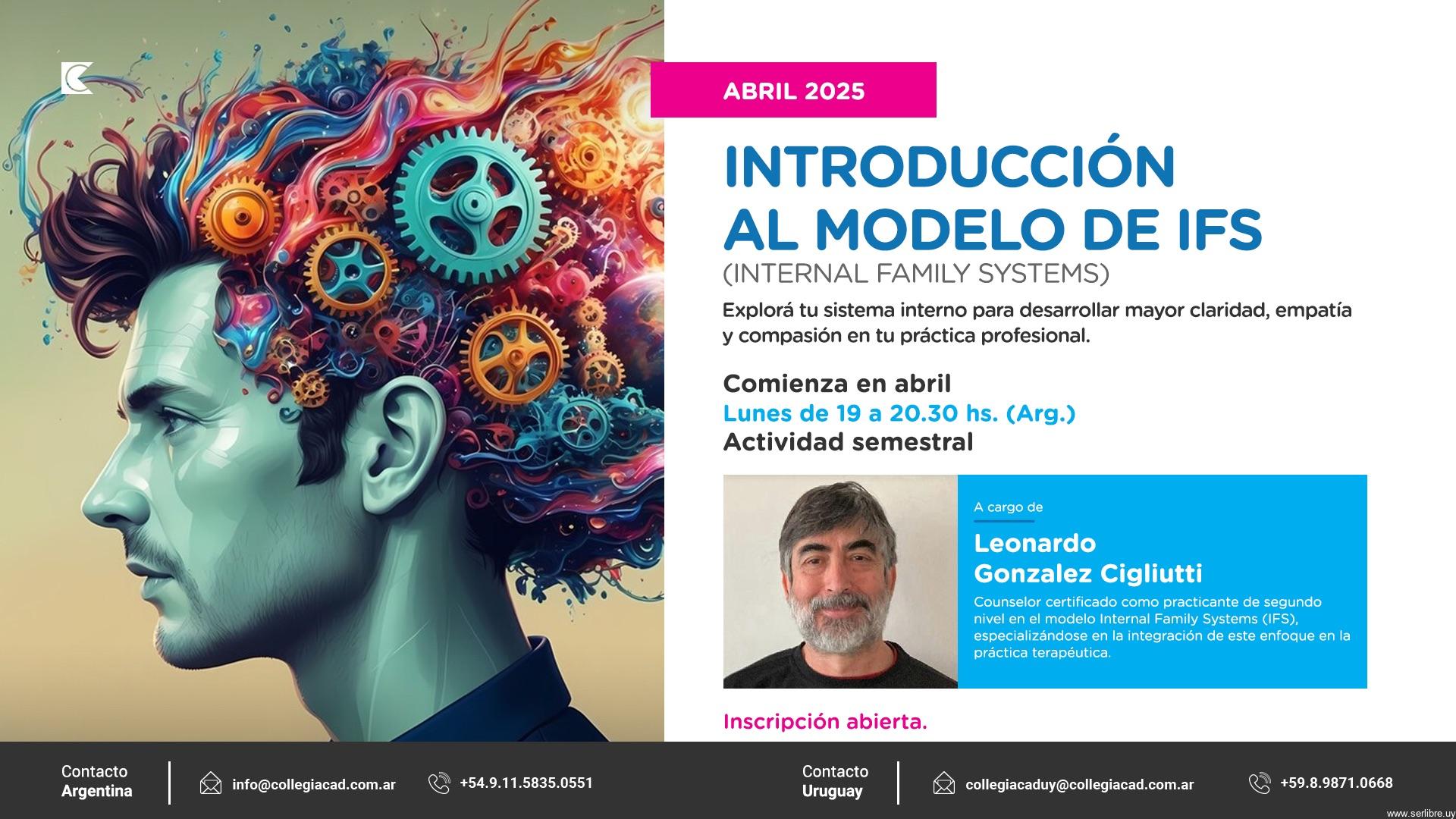 A cargo de LEONARDO GONZÁLEZ CIGLIUTI, Terapeuta con más de 25 años de experiencia en el ámbito de desarrollo personal. Es constelador familiar desde 2012, Counselor desde 2019 y está certificado desde 2022 como practicante de segundo nivel en el modelo Internal Family Systems (IFS), especializándose en la integración de este enfoque en la práctica terapéutica. Leonardo es también autor y editor del blog SerLibre.uy, donde ha publicado más de 300 artículos relacionados con el IFS y otros temas de bienestar emocional. Además, es facilitador de talleres y seminarios enfocados en el autoconocimiento y la sanación emocional.